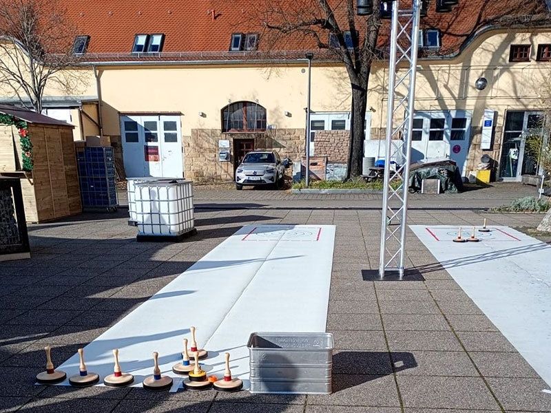 Unsere mobilen Eisstockbahnen sind wetterunabhängig und können auf fast allen Untergründen aufgebaut werden.