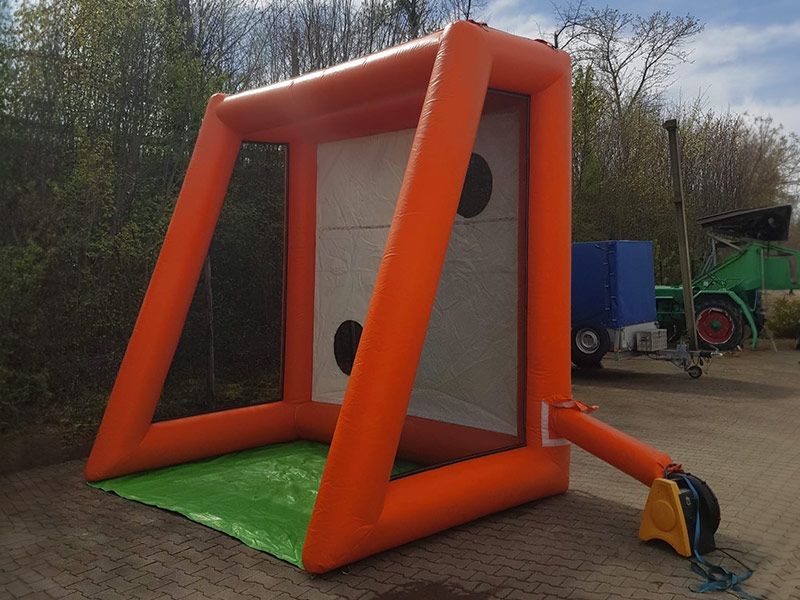 Aufblasbare Torwand orange. Mit Fangnetz hinter den Löchern.